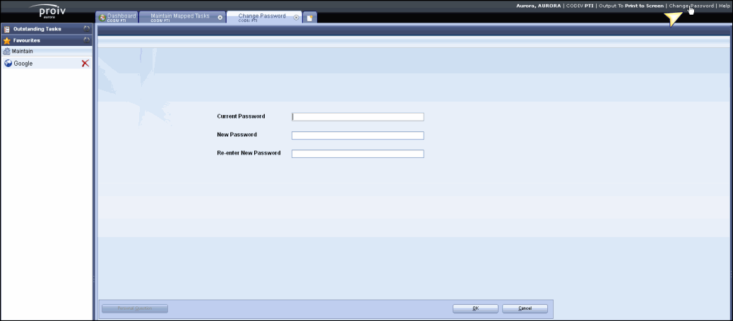 Click Change Password option in the User Information Bar. Click herehere to view a screenshot to help to locate the option in the Aurora workspace.